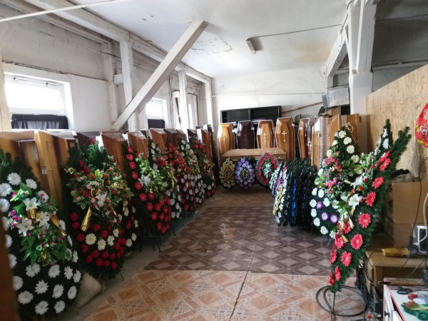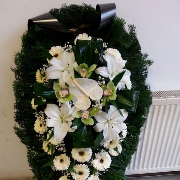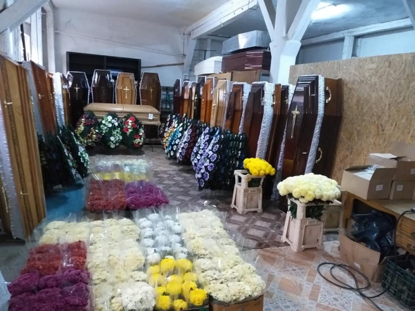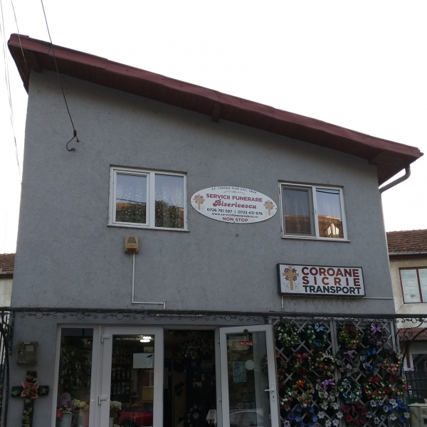 CORONA FLOR SRL - Funerarii Bisericescu va ofera o gama completa de servicii si articole funerare: sicrie din diferite esente de lemn (brad, stejar, tei, mahon s.a.), imbracaminte completa pentru sicrie, prosoape, batiste, lumanari, candele, coroane naturale si artificiale, coronite, jerbe, cruci din lemn si din metal, imbracaminte pentru decedati (costume, palari, camasi etc.). Daca decedatul/a a fost pensionar transportul sicriului de la magazin la domiciliu (capela, morga) este gratuit.